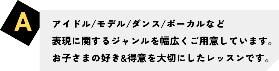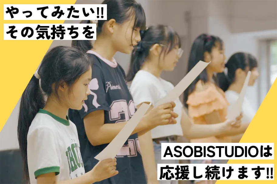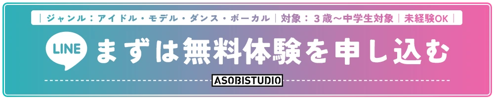 メニュー ASOBISTUDIOとは? ASOBISTUDIO始動の理由 通いたくなる3つの魅力とは? 応募条件について 応募の流れ よくあるご質問 個人情報の取り扱い 保護者の見学もOK!安心してご参加いただけます。 レッスン内容や日程など、お気軽にお問い合わせを。 「かわいい」も「かっこいい」も自分で選んで表現できる。 アイドル・モデル・ボーカル・ダンスなど多彩なジャンルを通して お子さまの“好き”と “個性”を見つけて伸ばすレッスンを行います。 講師は子どもたちの気持ちを 理解し、楽しさと 成長を両立させるプロ。 年齢やレベルに応じたクラス分け、少人数での丁寧な指導、通いやすい 都内スタジオなど、続けやすさと 安心感の両立にもこだわっています。 月4回から無理なく 通えるレッスンでスキルと自信を育てていきます。 年に数回の発表会ではステージに立って表現する経験もご用意。 “人前で頑張った”という実感がお子さまの大きな成長に繋がります。 ASOBISYSTEM主催の大型ライブイベント「ASOBIEXPO」などに、レッスン生がキッズダンサーとして出演できるチャンスも!プロのステージで輝く経験は、子どもたちにとって一生の宝物に。夢への第一歩をリアルに体感できます。 〒150-0001東京都渋谷区神宮前2-33-5パークノヴァ神宮前 2F 〒810-0041福岡県福岡市中央区大名1-2-16 セシオパーク大名 1F 関西の皆さまへ朗報!大阪校が開校予定!! 開校日が決まり次第、コチラからいち早くお届けします!! お気軽にお申込みください。まずは雰囲気を体感しよう!! コース内容・料金は地域によって変動する場合があります 少しでも気になる点はスタッフがお答え致します!! 住所、電話番号、氏名、性別、年齢(以下「個人情報」といいます。)はアソビシステムスタジオ運営事務局が管理します。お客様の個人情報は、本キャンペーンの当選者への連絡の目的で利用し、それ以外の目的では使用致しません。また、お客様の個人情報をお客様の同意なしに業務委託先以外の第三者に開示・提供することはありません。(法令等により開示を求められた場合を除きます) 個人情報開示訂正等のお問い合わせはアソビシステムスタジオ運営事務局info@asobistudio.comまでお願い致します。 アソビシステム株式会社 〒150-0001東京都渋谷区神宮前3-21-8T.S.原宿第2ビル 新人開発事業部 info@asobistudio.com 03-5413-3633 プライバシーポリシー ©ASOBISYSTEM co.ltd All Rights Reserved.